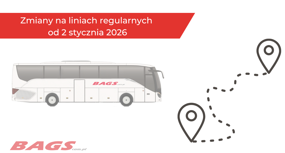 Informacja o kursowania autobusów BAGS w okresie świąteczno-noworocznym 29-30 grudnia - rozkłady jak w dzień powszedni z wyłączeniem kursów szkolnych oznaczonych "S" 31 grudnia (Sylwester) - sobotnie rozkłady jazdy 1 stycznia (Nowy Rok) - świąteczne rozkłady jazdy - wykonywane kursy bez oznaczenia "U" w niedzielno-świątecznych rozkładach jazdy. 2 stycznia (piątek) - rozkłady...